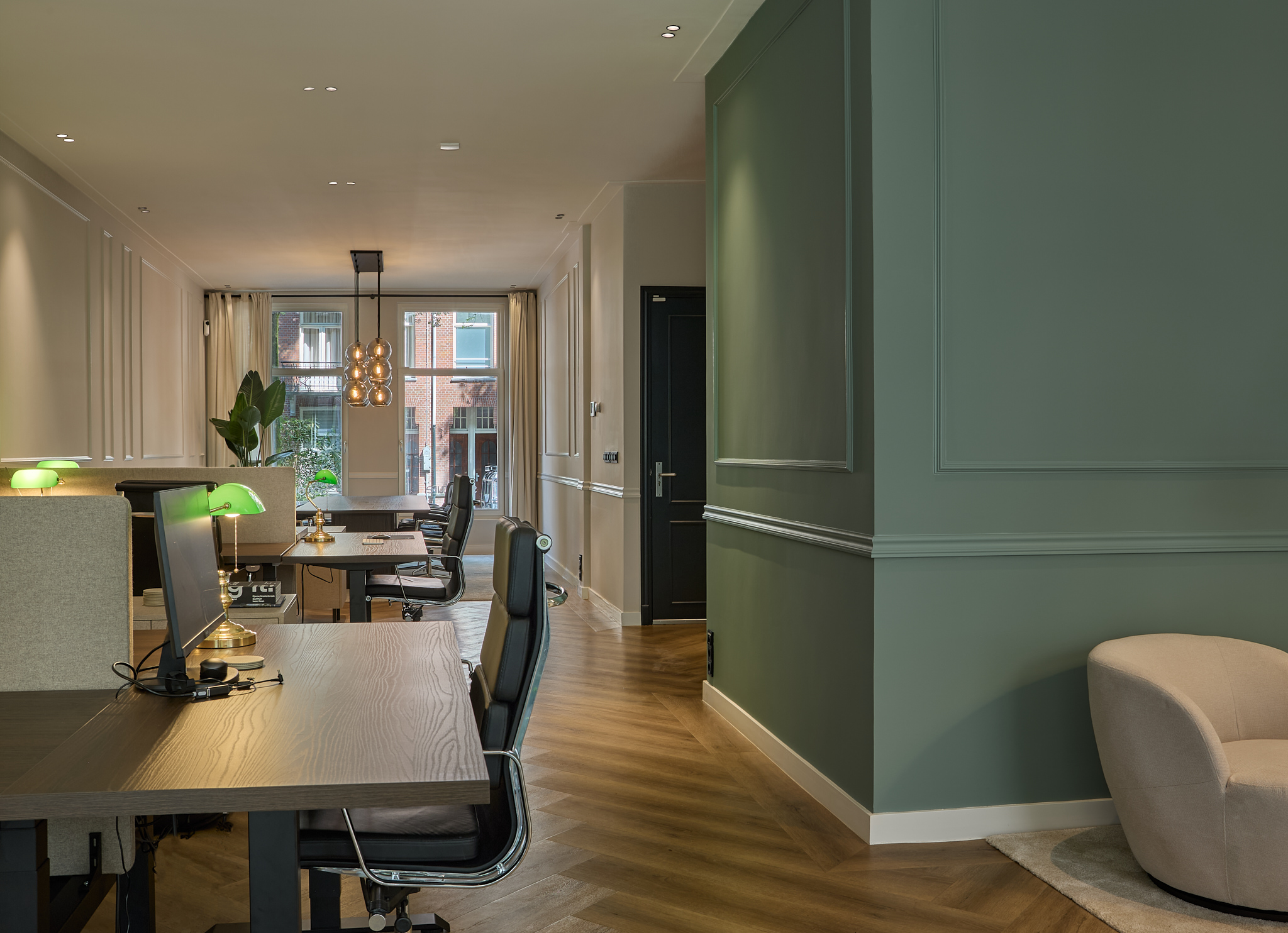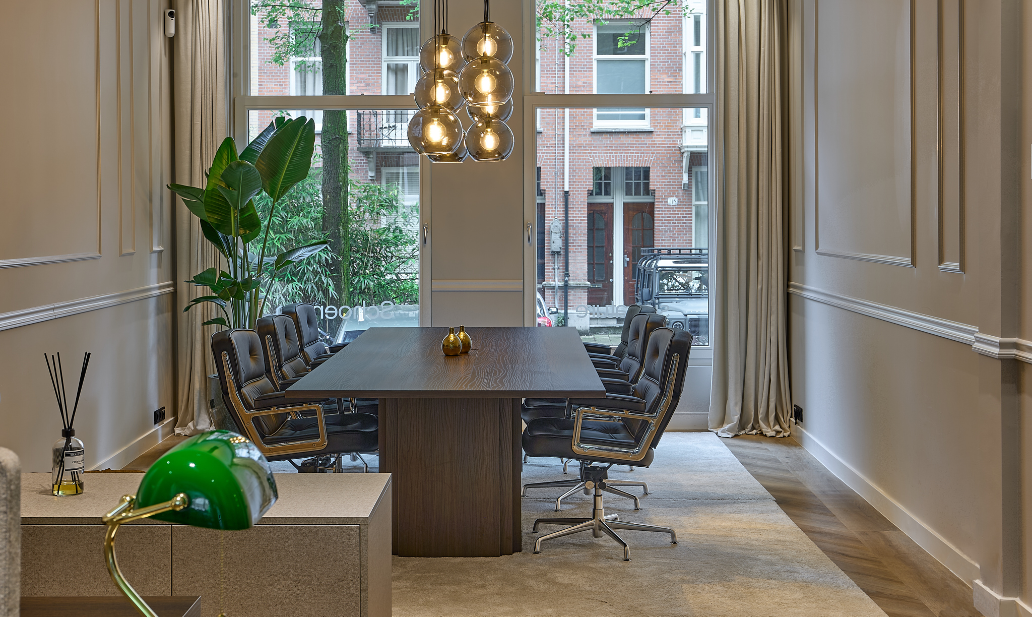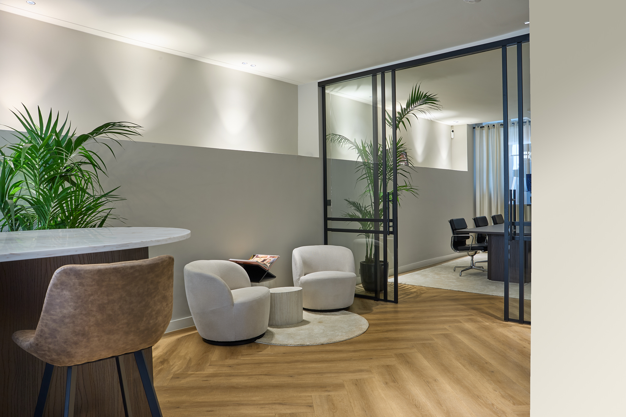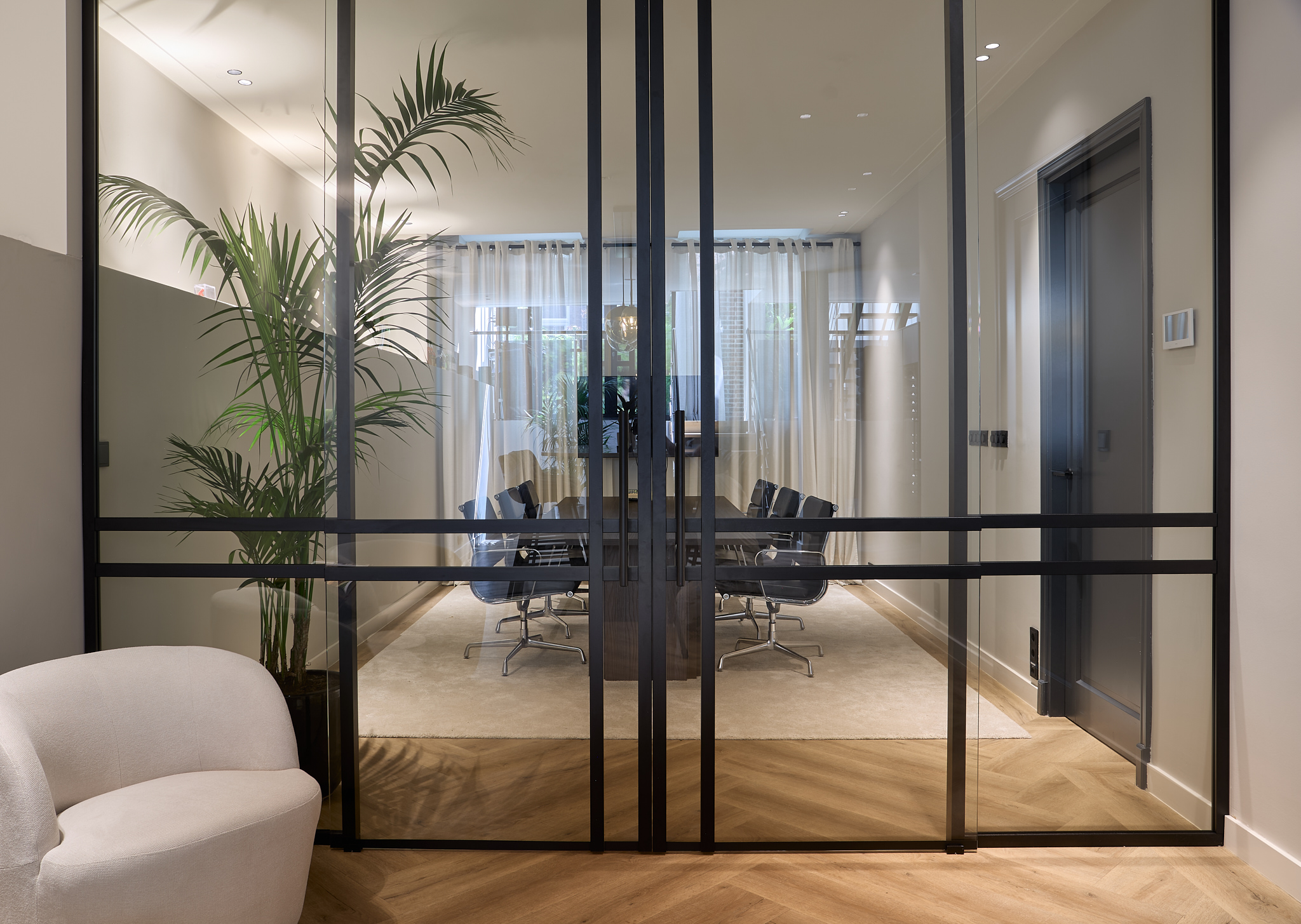 The office was developed in close collaboration with interior designer Orlando Tjin Asjoe. Together we designed a layout that prioritises the end-user. This creates a pleasant separation between the ground-floor workspaces and the meeting rooms in the basement, ensuring a quiet atmosphere upstairs while guests are welcomed downstairs.